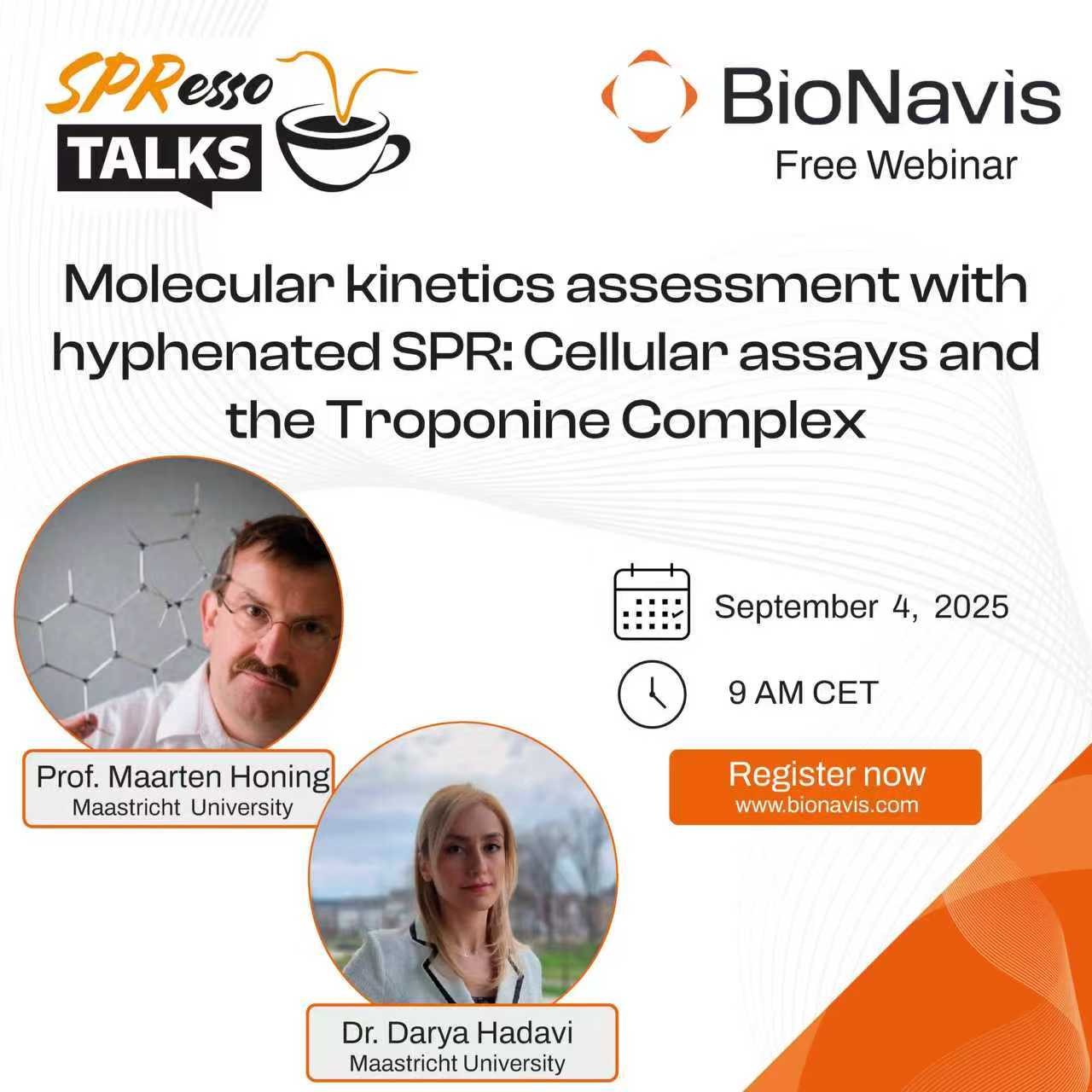 032025-09 加入BioNavis SPResso talks,獲知表面等離子體共振技術(shù)相關(guān)領(lǐng)域的最新研究成果。 一起聆聽(tīng)來(lái)自馬斯特里赫特大學(xué)的Maarten Honing教授和Darya Hadavi博士帶來(lái)的網(wǎng)...