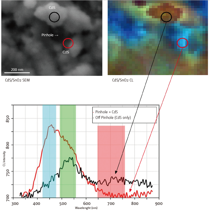 下面的SEM圖像和CL圖顯示了該技術(shù)在SnO2化學(xué)鍍液沉積的CdS上的針孔的實際應(yīng)用。發(fā)射圖譜如下: