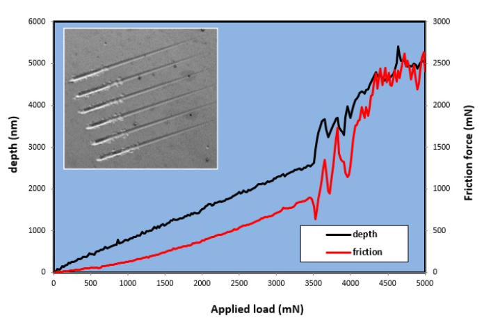 在WC-Co上使用100 μ m半徑的探頭進(jìn)行高達(dá)30 N的重復(fù)劃痕測(cè)試。