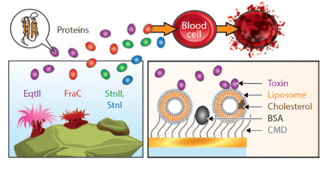 圖1。海葵放線(xiàn)素(成孔毒素)與脂質(zhì)膜結(jié)合導(dǎo)致細(xì)胞死亡。采用MP-SPR法測(cè)定Equinatoxin II (EqtII)、fragaceatoxin C (FraC)、sticholysin II (StnII)和sticholysin I (StnI)與脂質(zhì)囊泡的結(jié)合。