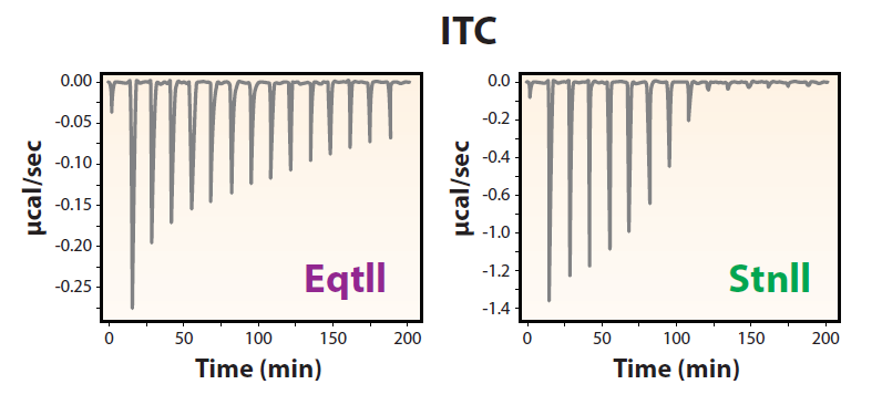 圖3。采用等溫滴定量熱法(ITC)研究了StnII和EqtII與DOPC:SM囊泡的結(jié)合。ITC的結(jié)果與MP-SPR的結(jié)果非常一致。
