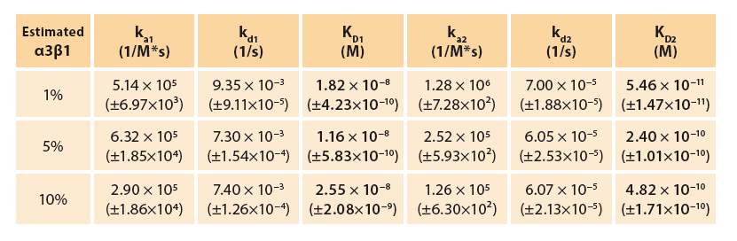 通過MP-SPR確定表面結合肽(LXY30)與流動的細胞外囊泡(SKOV-3)的相互作用(圖1)。使用TraceDrawer?軟件的“兩位點”結合模型分析相互作用,將其解釋為兩組肽分子與一個細胞外囊泡結合。本文對三種假設的電動汽車進行了評估,其中表面α3β1整合素的含量被評估為每顆??偟鞍椎?%,5%或10%。所有三個病例的親和力表明SKOV-3顆粒與表面結合的LXY30配體的強結合(圖2,表1)。在本研究中,僅測量了三種濃度的分析物,然而,通常建議測量五種或更多濃度來評估親和力和動力學。