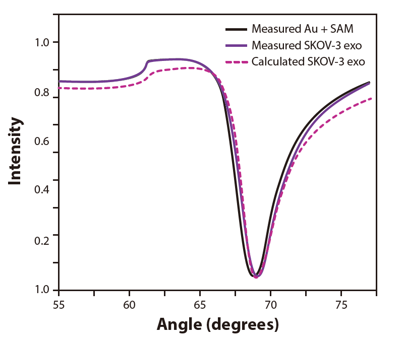 在MP-SPR實驗之前,BioNavis標準金傳感器載玻片被非原位涂覆一層自組裝的生物素化烷烴硫醇(11-巰基-1-十一醇,MuOH)單層(SAM)。進入儀器后,在運行緩沖液TRIS-EDTA (25 mM TRIS, 1mM EDTA, pH 8.0)中設置基線信號,然后在兩個通道中注射鏈霉親和素。生物素化LXY30肽僅在一個通道中引入,留下第二個通道作為參考,不含肽。從最低濃度到最高濃度(3.4 × 109、5.7 × 109和1.7× 1010顆粒/ml)順序注射,將卵巢癌細胞外囊泡SKOV-3加載到兩個通道中。使用TraceDrawer?for MP-SPR Navi?和MP-SPR Navi?LayerSolver對數(shù)據(jù)進行分析。