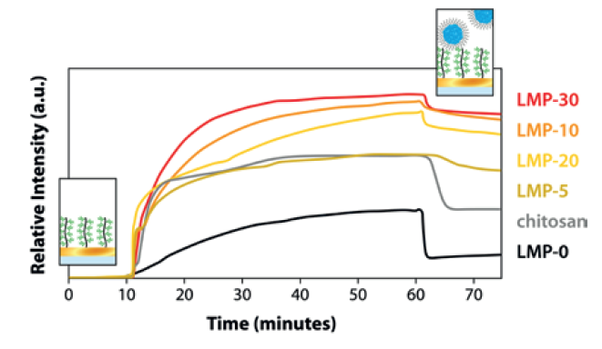 圖2所示:測定了不同苯基硼酸(PBA)含量(LMP-0、-5、-10、-20和-30)的嵌段共聚物膠束與粘蛋白的結(jié)合。膠束的黏附力隨PBA含量的增加而增加,并在LMP-10后達到平穩(wěn)期。以殼聚糖與粘蛋白結(jié)合為陽性對照。在MP-SPR固定角度模式下進行測量。