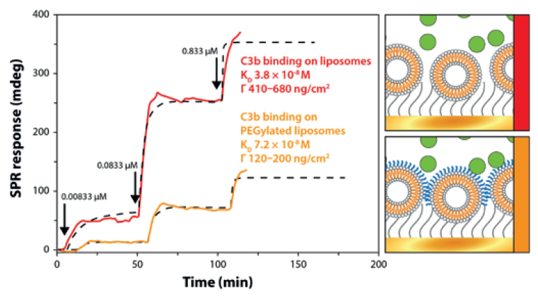 在另一項研究中,使用MP-SPR測量了C3b分子與脂質(zhì)體的結(jié)合。C3b是先天免疫系統(tǒng)的一部分,它作為一種調(diào)理劑增強吞噬作用(更具體地說,標記細胞進行吞噬)。C3b對聚乙二醇化寡聚胍脂質(zhì)修飾(OGP + PEG)脂質(zhì)體的親和力為KD = 7.2 × 10?8 M,表面質(zhì)量密度Γ = 120 ~ 200 ng/cm2。不含PEG的脂質(zhì)體上的結(jié)合水平較高。