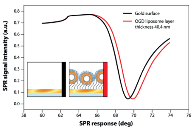 圖3。C3b與低聚胍脂修飾(OGD)脂質(zhì)體的結(jié)合。不含PEG的脂質(zhì)體的結(jié)合明顯更強。測量在MP-SPR的角掃描模式下進行。