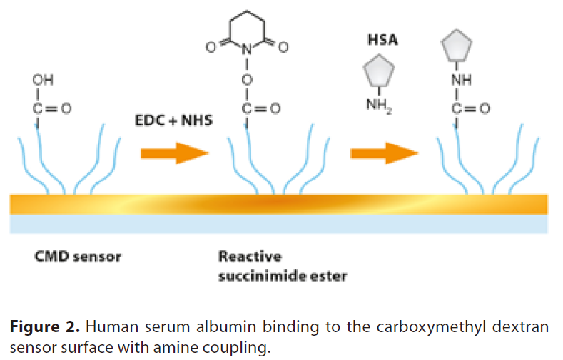 羧基甲基葡聚糖(CMD)包被的傳感器載玻片通過胺偶聯(lián)化學(xué)固定HSA(圖2)。固定在21°C下進(jìn)行,使用5 mM MES (2-(N-morpholino)乙磺酸)pH 5.0作為運(yùn)行緩沖液。表面用EDC/NHS活化,用5mM乙醇胺(pH 8.0)滅活。