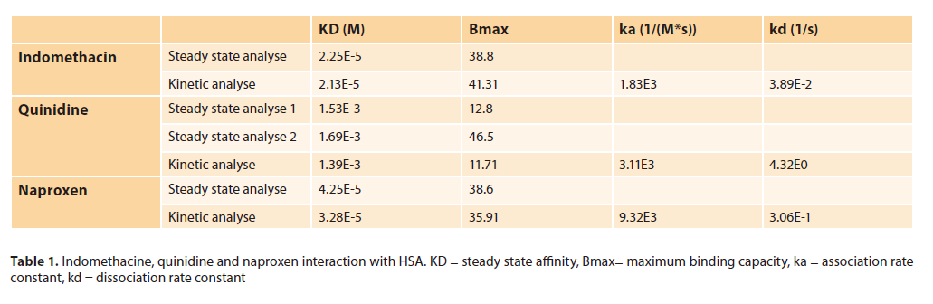 采用SPR Navi 220A型儀器測定小分子藥物吲哚美辛、奎尼丁和萘普生(357.8、324.4和230.3 g/mol)與固定化HSA的相互作用。實(shí)驗(yàn)采用pH為7.4的PBS(磷酸鹽緩沖鹽水)作為運(yùn)行緩沖液,溫度為21℃。測量5個(gè)樣品濃度系列(0.1 ~ 50 μM)??岫∈禽^弱的結(jié)合劑,因此測定了較高的濃度(10 ~ 500 μM)。樣品中含有3%的二甲基亞砜(DMSO),以提高藥物的溶解度。用TraceDrawer分析了反應(yīng)的動(dòng)力學(xué)和親和性。