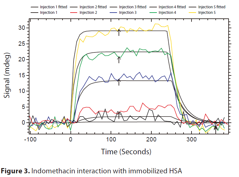 根據(jù)BioNavis固定方案,成功重復(fù)多次固定化HSA。傳感器表面固定HSA的平均量為2000 ng/cm2。通過MP-SPR測量,成功測定了三種小分子量藥物對(duì)HSA的穩(wěn)態(tài)親和力和結(jié)合動(dòng)力學(xué)(表1)。吲哚美辛的親和力圖和動(dòng)力學(xué)分析如圖3和圖4所示。分別測定兩次奎尼丁的結(jié)合度,得到的等結(jié)合值證實(shí)了結(jié)果的重復(fù)性。