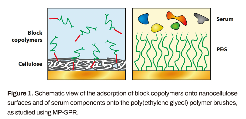 聚合物被廣泛研究,通常相互作用在產(chǎn)品功能中起著關鍵作用。使用無標記實時多參數(shù)表面等離子體共振(MP-SPR)進行了兩個單獨的聚合物相互作用研究。通過嵌段共聚物的吸附實現(xiàn)了納米纖維素表面的功能化。通過測定血清樣品的吸附量來量化聚乙二醇基聚合物刷的防污效果?;贛P-SPR測量,進一步表征了聚合物的厚度和吸附質量。納米纖維素功能化是成功的,并發(fā)現(xiàn)-OH端接的10 kDa聚乙二醇是最好的防污涂層,具有99%的電阻率。