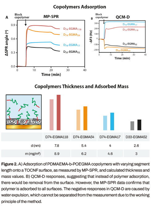 MP-SPR測量證實,所有的PDMAEMA-bPOEGMA共聚物都在很大程度上吸附在temooo氧化的納米纖化纖維素表面(圖2)。吸附量取決于聚合物段長度。測量的MP-SPR值與石英晶體微平衡耗散(QCM-D)測量值進行了比較,然而,QCM-D中的響應不僅與質量攝取有關,而且還受到電荷中和和表面水排出(脫水)的影響,導致一些共聚物的負響應(圖2)。MP-SPR將水從聚合物的吸附質量中分離出來,因此,結果提供了對聚合物吸附動力學和質量的真正見解。