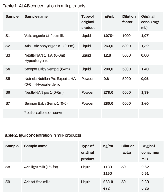 樣品是從芬蘭超市購(gòu)買的不同的奶制品(圖1)。粉末樣品根據(jù)包裝上的說(shuō)明制備成液體形式,并進(jìn)一步稀釋1000或50倍(正常牛奶)和5000倍(嬰兒產(chǎn)品)。使用90秒的樣品注射(校準(zhǔn)或牛奶樣品),120秒的等待時(shí)間和60秒的ALAB再生注射進(jìn)行測(cè)量。IgG注射時(shí)間較長(zhǎng)。ALAB的校準(zhǔn)范圍為0 - 1000 ng/mL, IgG的校準(zhǔn)范圍為0 - 75 000 ng/mL。校正曲線符合4參數(shù)Low-High方程,也可用于測(cè)定樣品中的蛋白質(zhì)濃度。