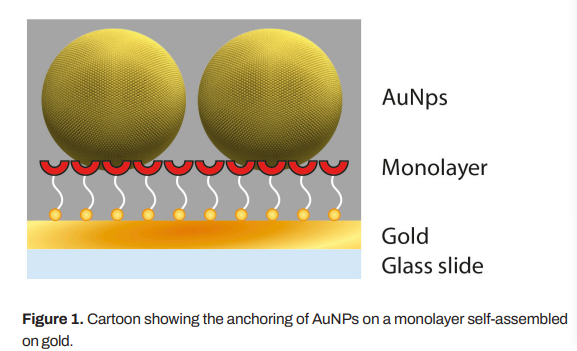 將金納米顆粒固定在自組裝的單層金上。單分子層鏈端上的官能團(tuán)促進(jìn)了金納米顆粒在層上的錨定。多參數(shù)表面等離子體共振(MP-SPR)可以實(shí)時(shí)測(cè)量金納米顆粒與表層的結(jié)合情況。