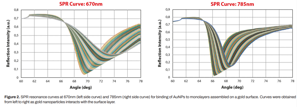 在金表面組裝具有官能團(tuán)的單層膜可用于金納米粒子的偶聯(lián)。在這項(xiàng)研究中,MP-SPR被證明是實(shí)時(shí)測(cè)定金屬納米顆粒沉積到表面層的獨(dú)特方法。AuNPs表現(xiàn)出強(qiáng)烈的表面等離子體共振,當(dāng)納米顆粒與表面層相互作用時(shí),MP-SPR甚至可以觀察到很大的響應(yīng)。鏈末端的官能團(tuán)可以錨定金納米顆粒,甚至嵌入到鏈中。MP-SPR是一種獨(dú)特的工具,用于研究金屬納米顆粒在傳感器、電子、光子學(xué)、太陽(yáng)能電池或癌癥診斷和治療中的應(yīng)用。